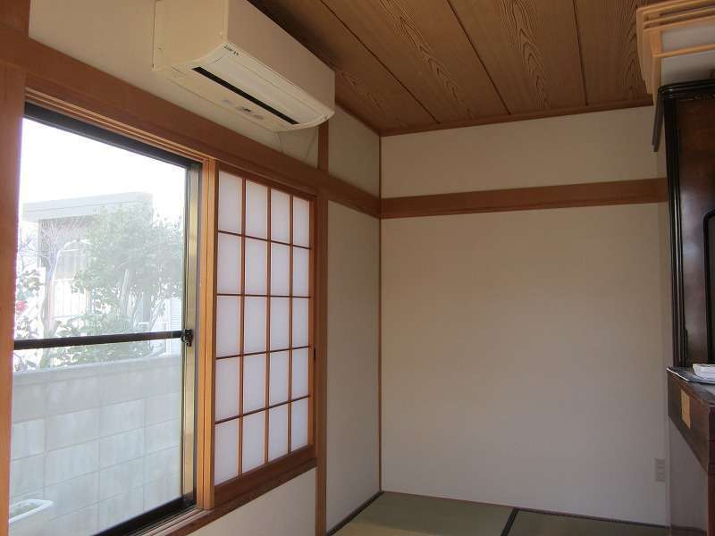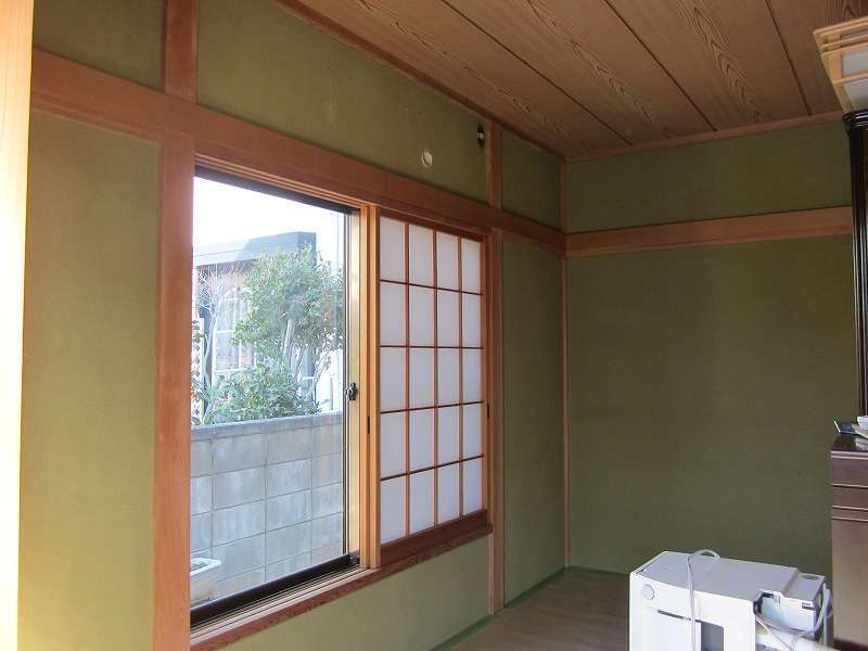 以前、雨漏り修理でバルコニー防水工事をさせていただいたお客様からのご依頼でした。和室の壁を明るくしたいとのことで、ボードを貼って、クロス貼りにするご提案をさせていただきました。深い緑系の色から白系になりとても明るい和室に生まれ変わりました。
