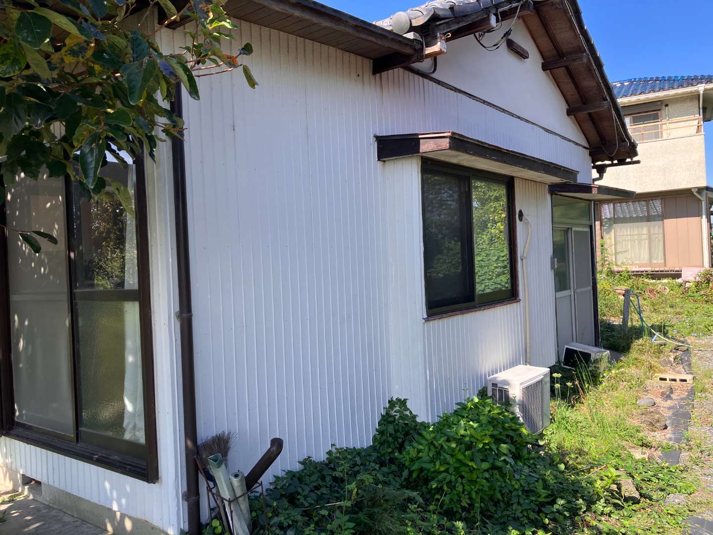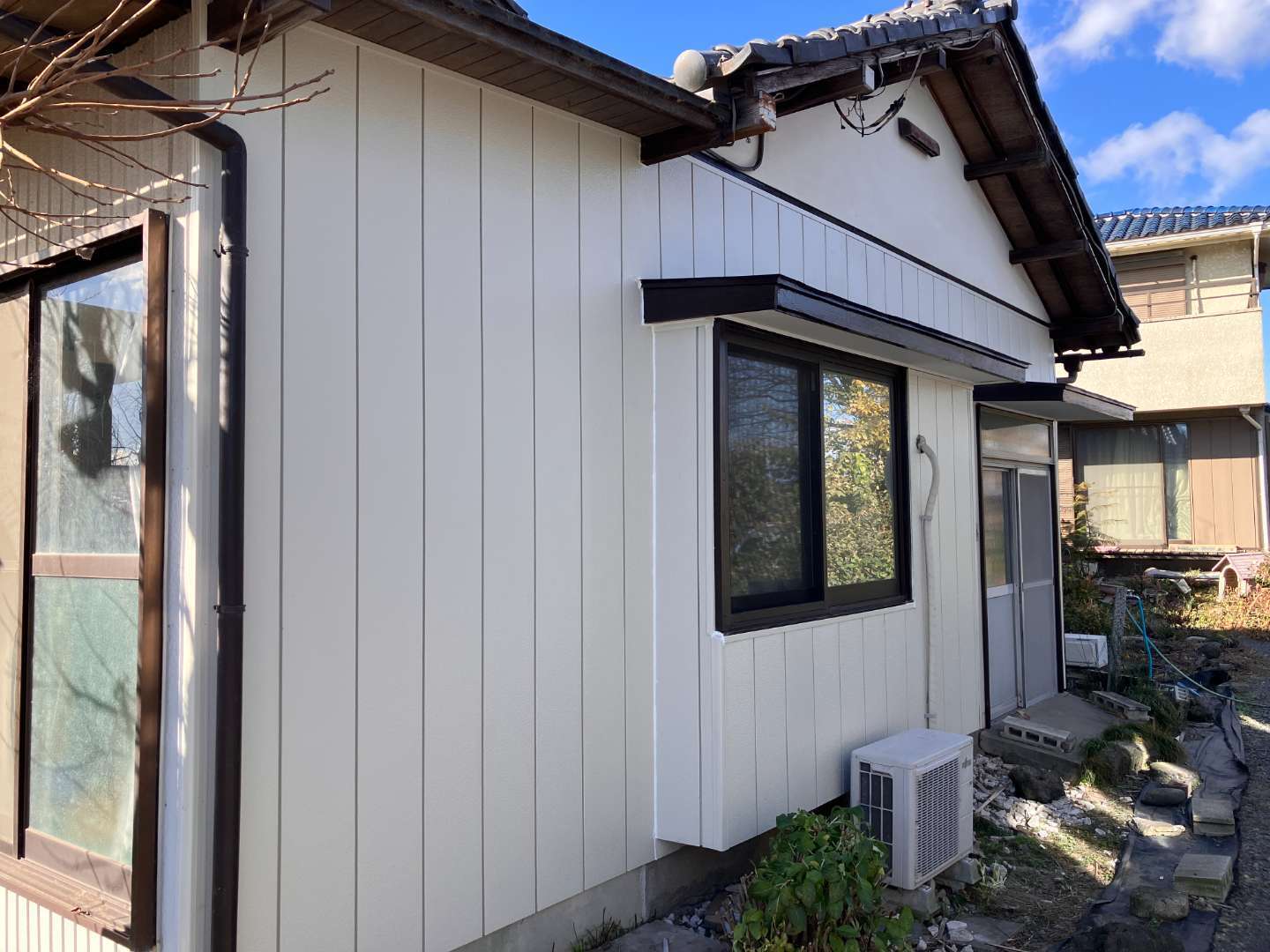 古い外壁材を撤去し、透湿シート、下地調整を行い、ニチハ製センターサイディングA型を貼りました。庇や木部の塗装も行い、1面が綺麗に仕上がりました。